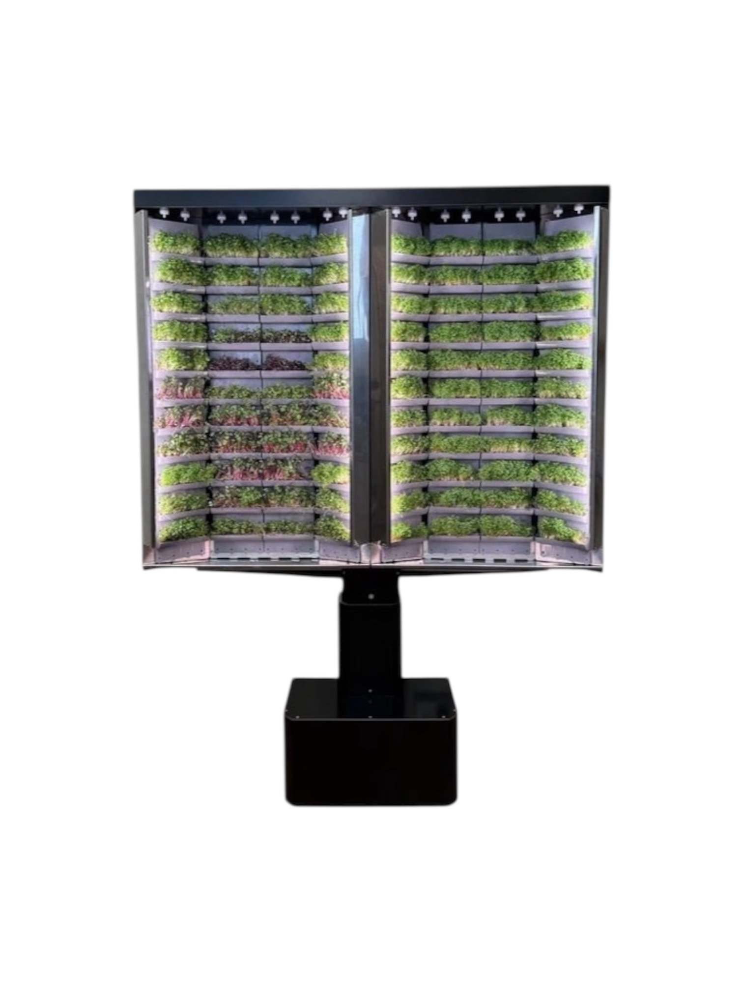 Закрытая напольная ферма с прозрачным стеклом Габариты: 830*1850*730 мм Количество модулей: 132 Энергопотребление: 65 Вт Поворотный механизм Встроенный фитосвет и автополив Датчик уровня воды Управление с помощью смартфона