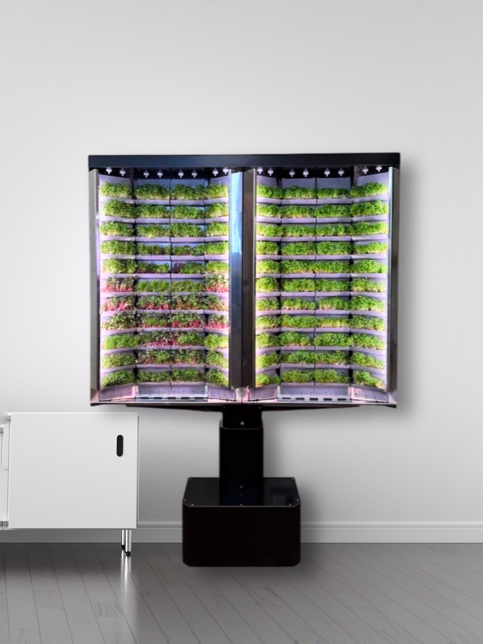 Открытая настенная ферма Габариты: установка 1280*1150*200 мм приставной экран 455*250*510 мм Количество модулей: 88 Энергопотребление: 80 Вт Встроенный фитосвет и автополив Датчик уровня воды Управление с помощью смартфона